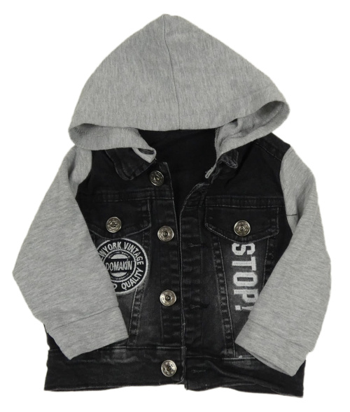 Černo-šedá riflovo/tepláková bunda s nápisy a kapucí