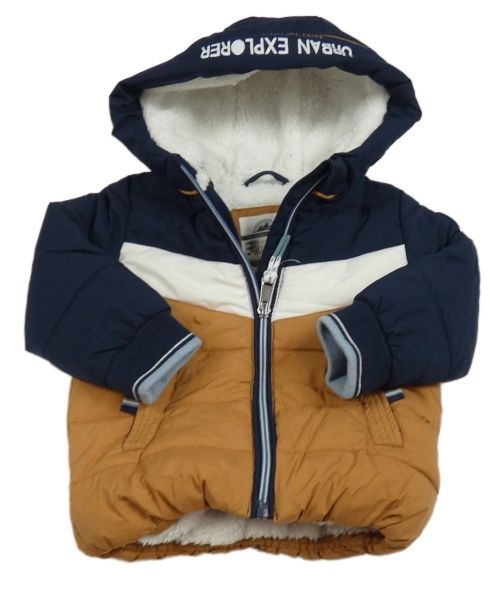 Tmavomodro-hnědo-bílá šusťáková zimní bunda s kapucí