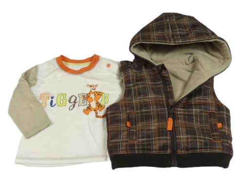 2set - Hnědo-béžová kostkovaná šusťáková zateplená vesta s kapucí + krémovo-béžové triko s Tygrem George