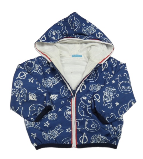 Tmavomodrá šusťáková podzimní bunda s vesmírem a kapucí