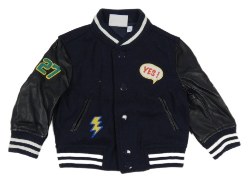 Tmavomodro-černý vlněno/koženkový jarní bomber s bleskem a číslem a pruhy