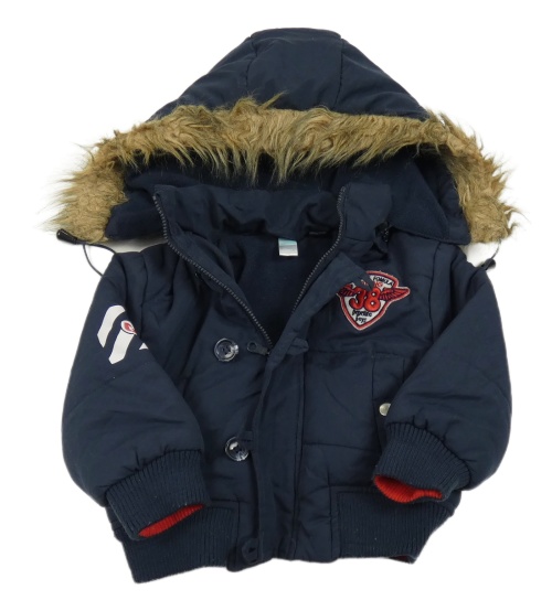 • Tmavomodrý prošívaný šusťákový zimní bomber s nášivkou a odepínací kapucí s kožešinou coolclub