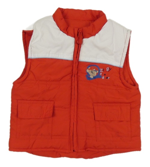 Červeno-bílá šusťáková zateplená vesta s medvědem St. Bernard