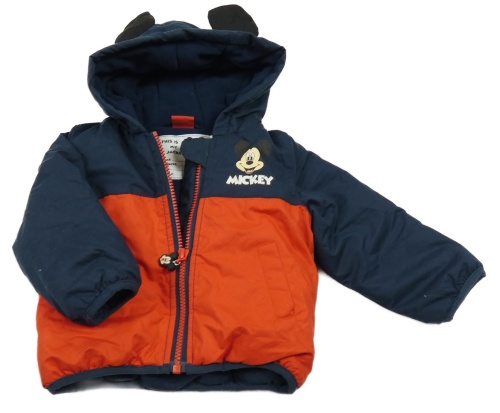 Tmavomodro-červená šusťáková zateplená bunda s Mickeym a kapucí Disney