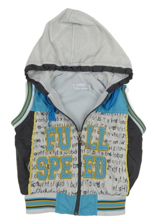 Modro-šedá šusťáková podšitá vesta s nápisy a kapucí