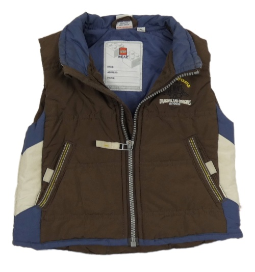 Hnědo-bílo-modrá šusťáková zateplená vesta s výšivkou