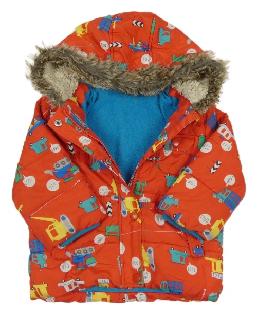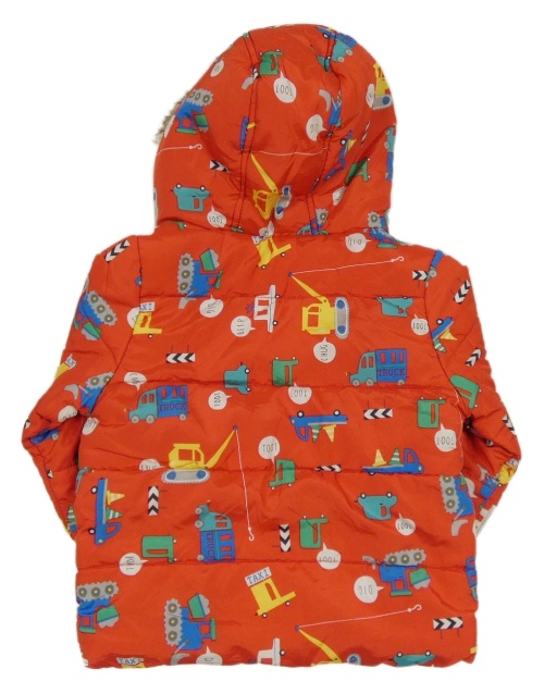 Červená šusťáková zimní bunda s auty a kapucí Mothercare