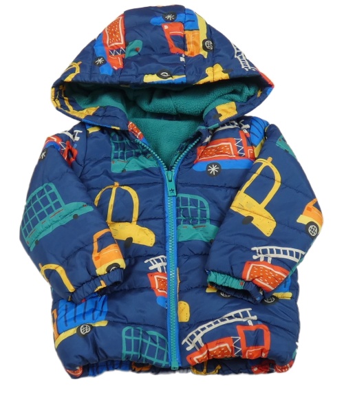 Tmavomodrá prošívaná šusťáková zimní bunda s auty a autobusy a hasiči a kapucí St. Bernard