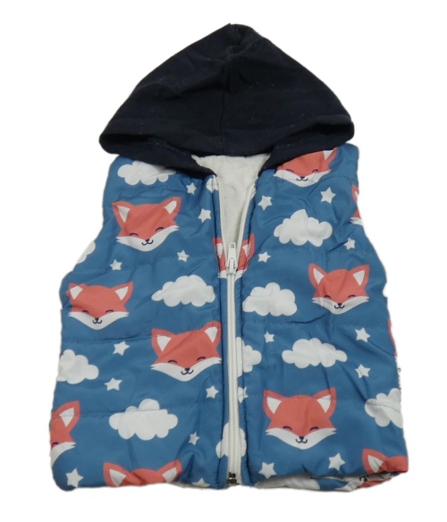 Modrá šusťáková zateplená vesta s liškami a teplákovou kapucí