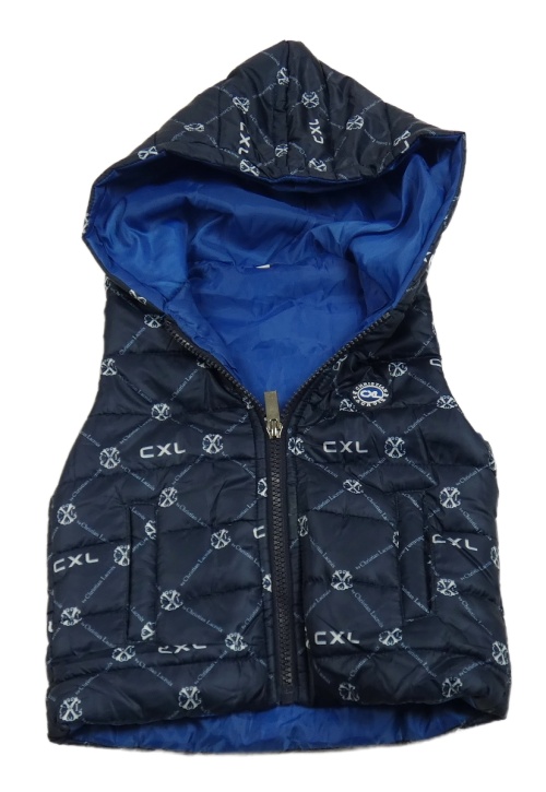 Tmavomodrá vzorovaná šusťáková prošívaná vesta s kapucí