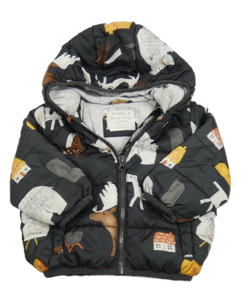 Černá prošívaná šusťáková zateplená bunda se zvířátky a domečky a kapucí M&S