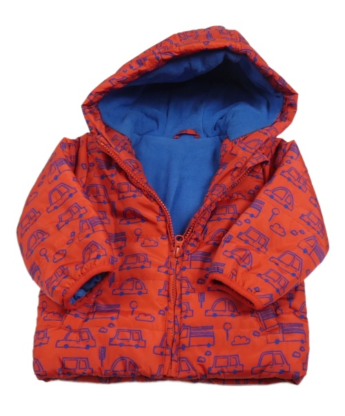 Červená prošívaná šusťáková zimní bunda s auty a kapucí St. Bernard
