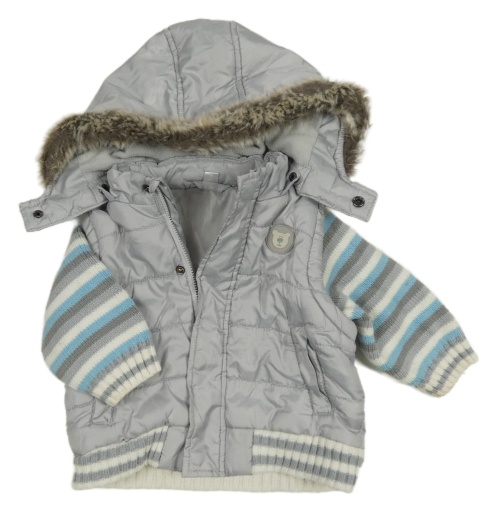 • Světlešedá kostkovaná prošívaná šusťáková zateplená vesta s medvídkem a pruhovanými pletenými rukávy a kapucí s kožešinou coolclub