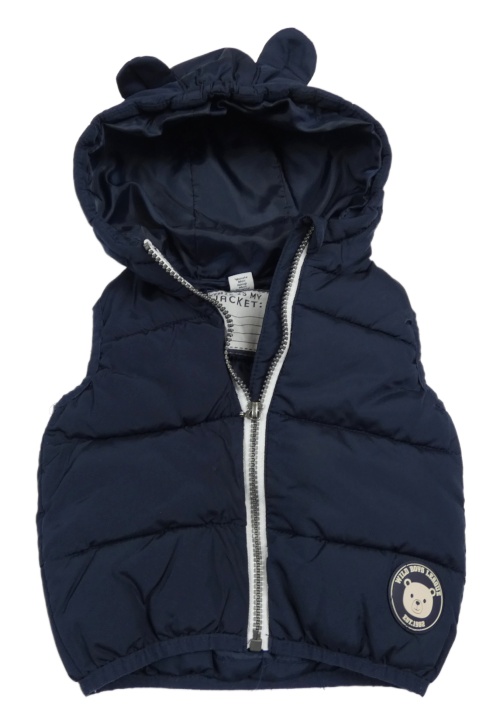 Tmavomodrá prošívaná šusťáková zateplená vesta s medvídkem a kapucí s oušky dopodopo