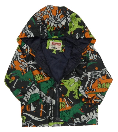 Černá šusťáková jarní bunda s dinosaury a kapucí