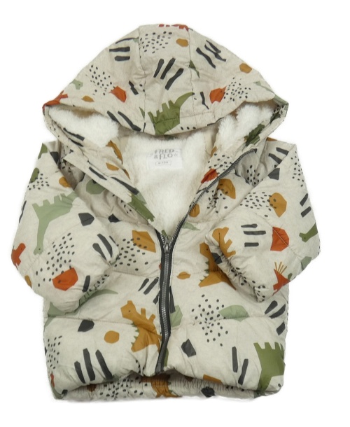 Světlešedo-smetanová prošívaná šusťáková zimní bunda s dinosaury a kapucí F&F