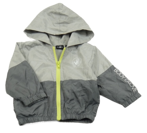 Šedo-tmavošedá šusťáková jarní bunda s potiskem a kapucí