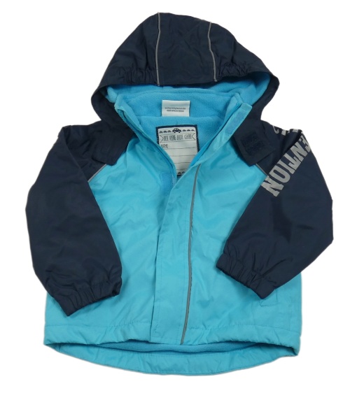 Azurovo-tmavomodrá šusťáková jarní bunda s nápisem a kapucí Topomini