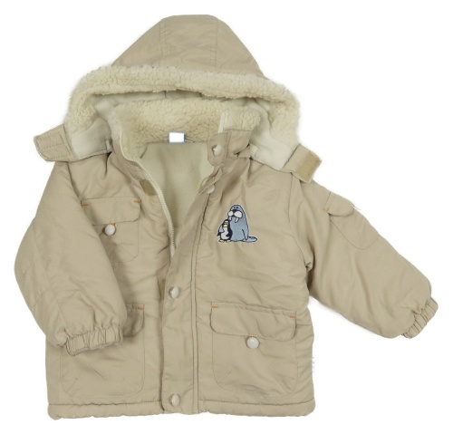 Béžová šusťáková zimní bunda se zvířaty a kapucí