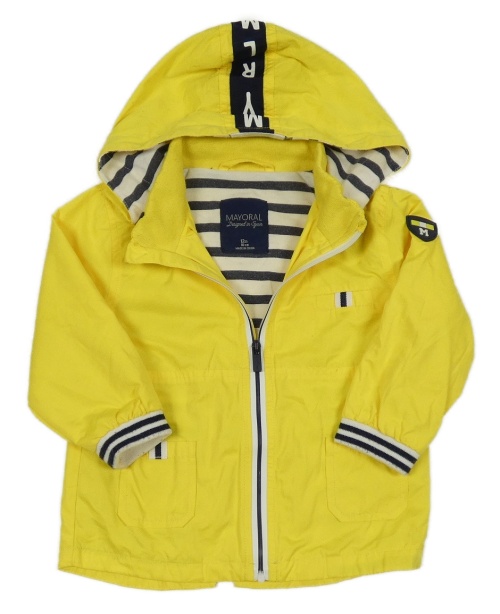 Žlutá šusťáková jarní parka s nášivkou a pruhy a odepínací kapucí Mayoral