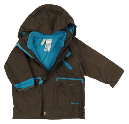 • 3v1 - Hnědo-světlemodrá šusťáková celoroční funkční bunda s kapucí + modrá fleecová mikina Quechua