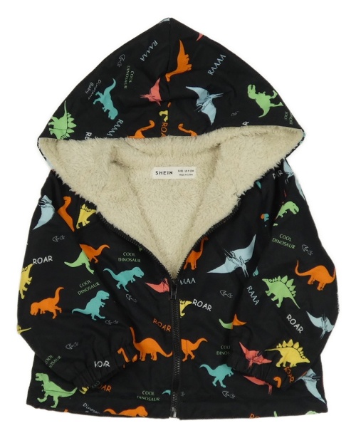 Černá šusťáková zateplená bunda s dinosaury a kapucí Shein