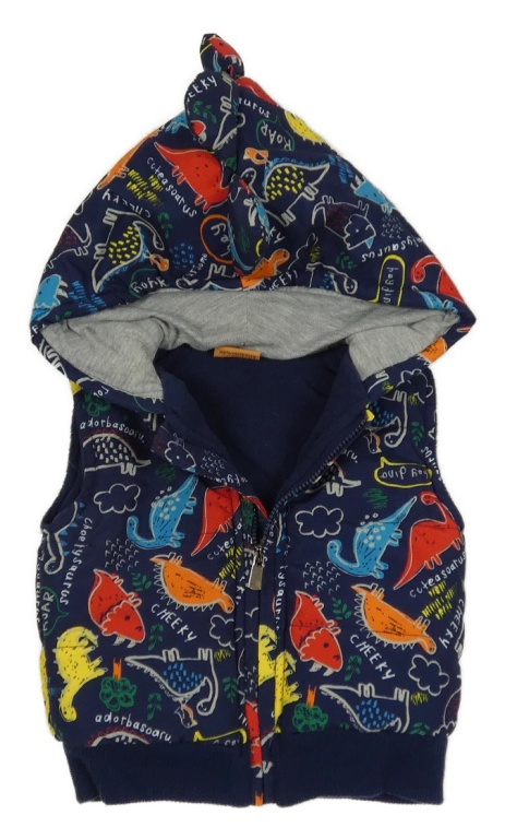 Tmavomodrá prošívaná šusťáková zateplená vesta s dinosaury a kapucí s ostny Cheeky Chimp