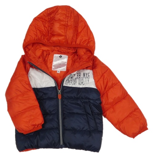 Červeno-tmavomodro-bílá šusťáková zateplená bunda s nápisem a kapucí
