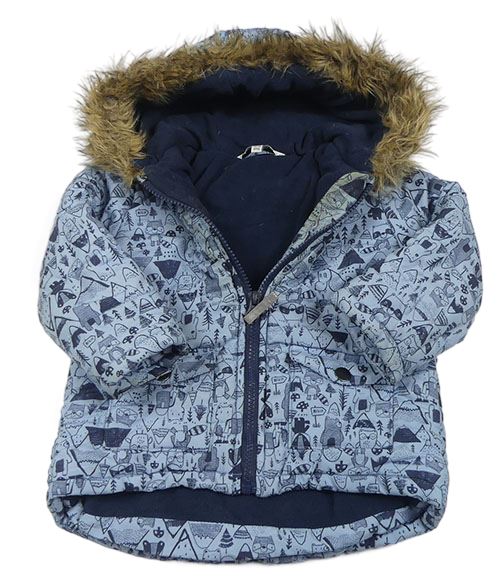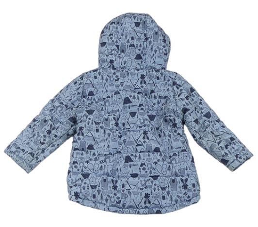 Světlemodrošedá prošívaná šusťáková zimní bunda se zvířátky a kapucí s kožešinou Peacocks