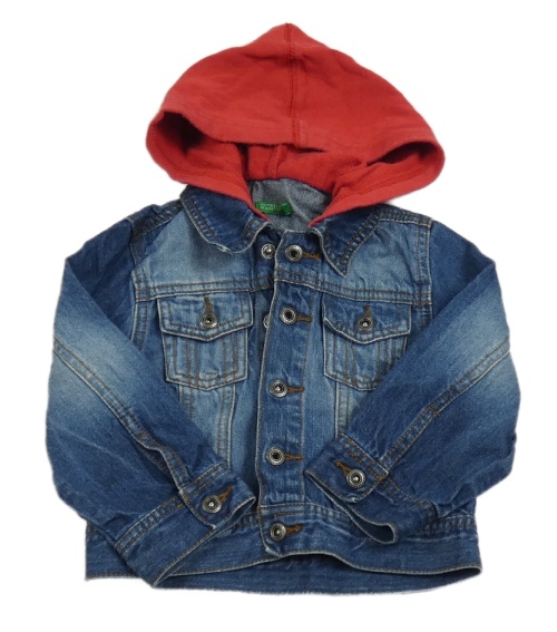 Tmavomodrá riflová bunda s červenou teplákovou kapucí Benetton