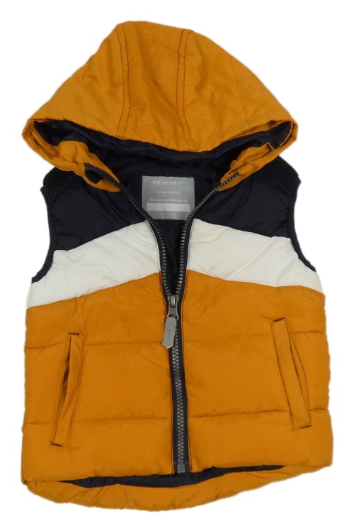 Hořčicovo-bílo-tmavomodrá šusťáková zateplená vesta s kapucí Primark