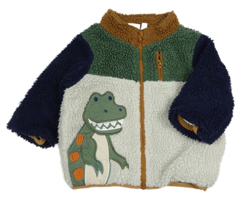 Zeleno-bílo-tmavomodrá huňatá podšitá bunda s dinem Jojo Maman Bébé