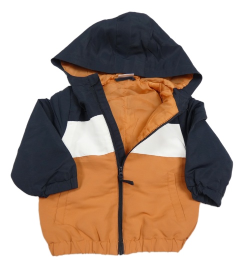 Tmavomodro-cihlovo-bílá šusťáková zateplená bunda s kapucí