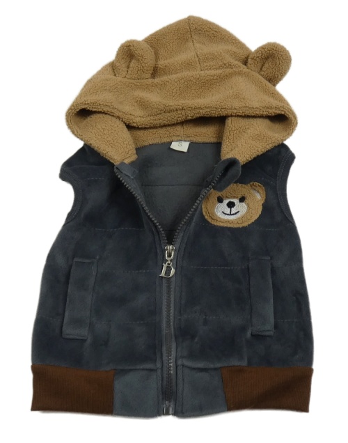Antracitovo-hnědá sametovo/chlupatá vesta s medvědem a kapucí