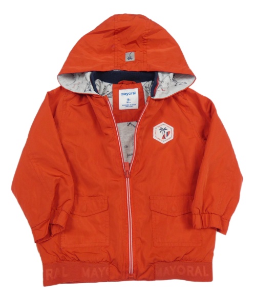 Červená šusťáková jarní bunda s nášivkou a kapucí Mayoral
