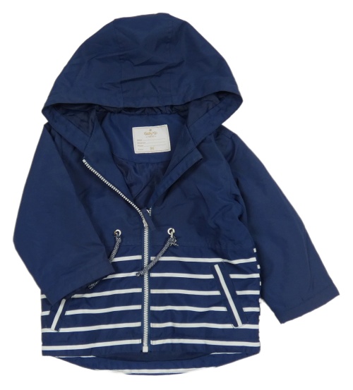 Tmavomodrá šusťáková zateplená bunda s proužky a kapucí