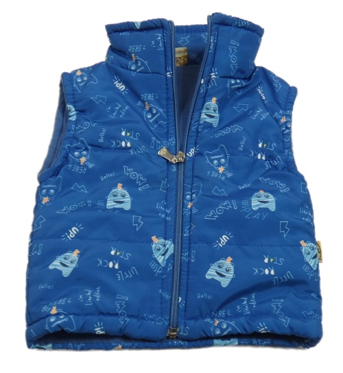Modrá šusťáková zateplená vesta s nápisy a příšerkami