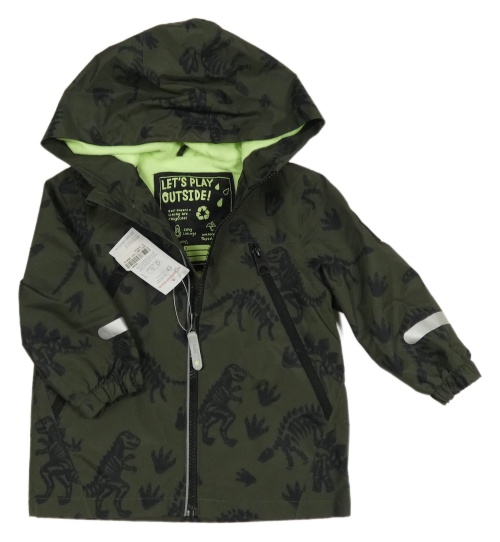 Nové - tmavokhaki kostkovaná šusťáková jarní bunda s kostrami dinosaurů a kapucí F&F