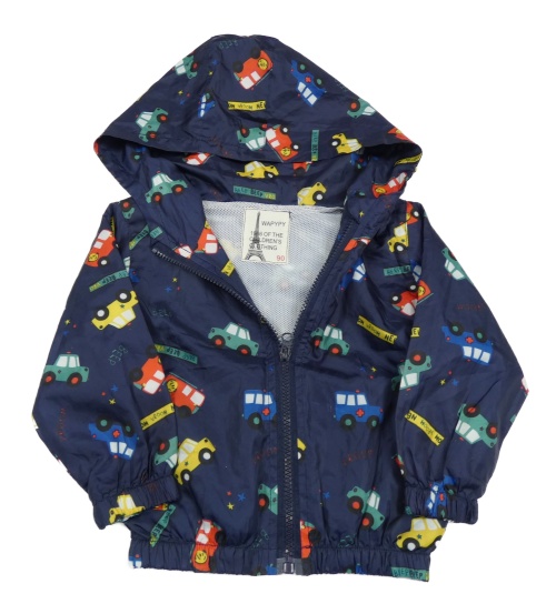 Tmavomodrá šusťáková jarní bunda s autíčky a kapucí