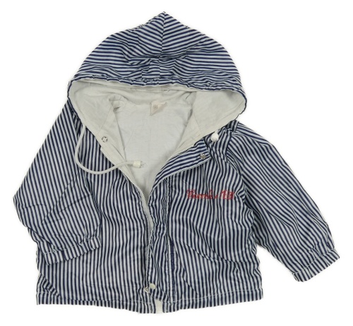 Tmavomodro-bílá pruhovaná šusťáková jarní bunda s logem a kapucí