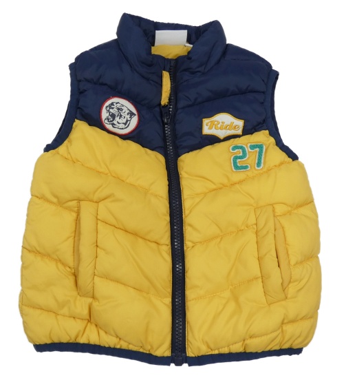 Tmavožluto/tmavomodrá prošívaná šusťáková zateplená vesta s číslem a nášivkami