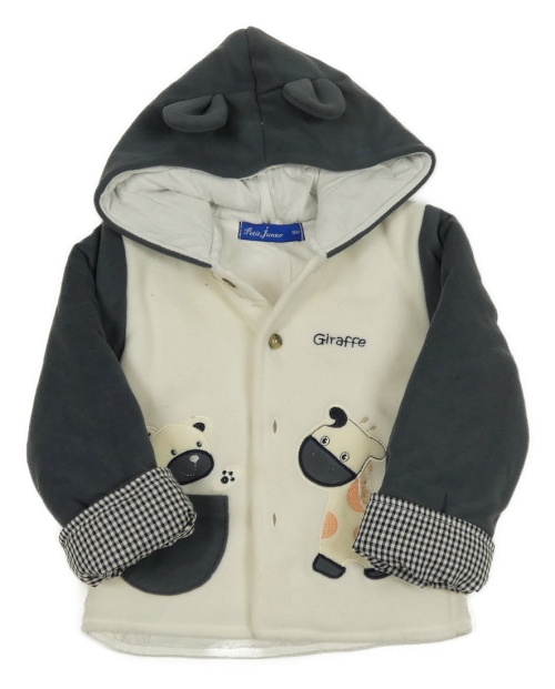 Smetanovo-tmavošedý fleecový zateplený kabátek se zvířaty a kapucí