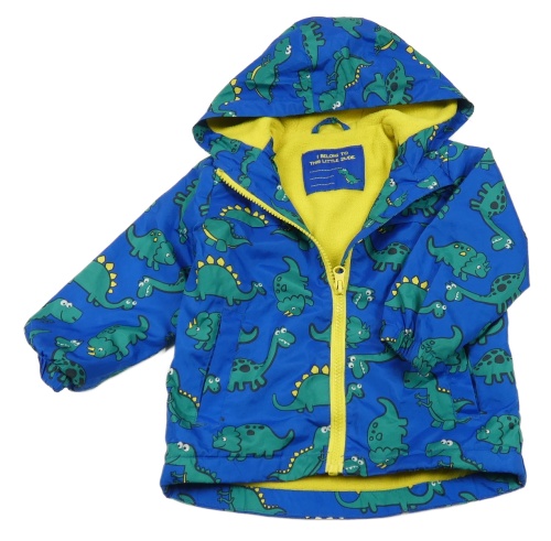 Modro-zelená šusťáková jarní bunda s dinosaury a kapucí St. Bernard