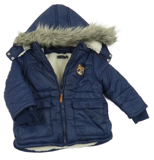Tmavomodrá šusťáková zimní bunda s mývalem a kapucí