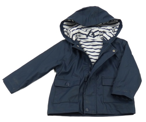 Tmavomodrá nepromokavá jarní bunda s nápisem a kapucí