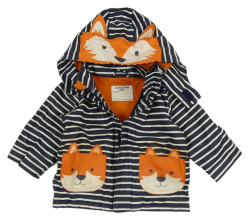 Tmavomodro-bílo-oranžová pruhovaná voděodolná jarní bunda s liškami a kapucí Jojo Maman Bébé