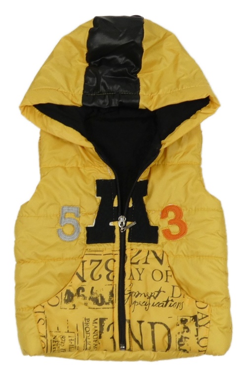 Žluto-černá šusťáková prošívaná zateplená vesta s nápisy a kapucí
