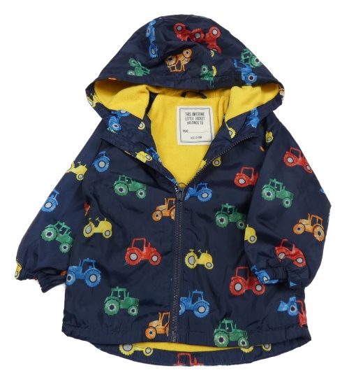 Tmavomodrá šusťáková jarní bunda s traktory a kapucí Matalan
