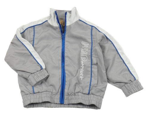 Šedo-modro-bílá šusťáková jarní bunda s nápisem