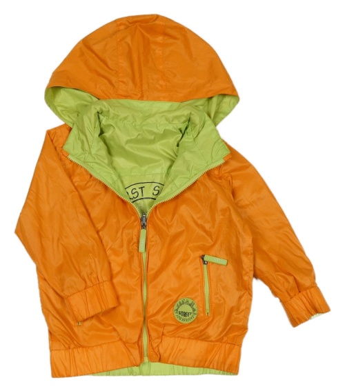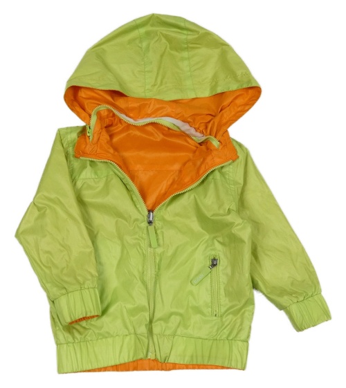 Světlezeleno-oranžová šusťáková jarní oboustranná bunda s kapucí